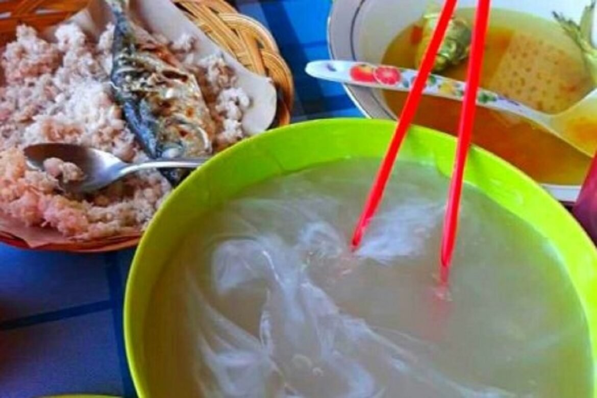 Hidangan pertama yang dicicipi adalah onyop, makanan khas yang mirip papeda dan terbuat dari sagu. Disajikan dengan kuah asam segar berisi tomat, cabai, dan bawang merah, onyop memiliki tekstur kenyal dan dinikmati tanpa perlu dikunyah. Penyajiannya pun unik, dimulai dengan menuangkan kuah ke piring terlebih dahulu agar onyop tidak lengket.
